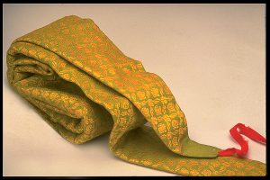 Ζωνάρι (κιμέρι). Μακρόστενη ζώνη από ανοικτό πράσινο βαμβακερό ύφασμα με ύφανση που σχηματίζει ανάγλυφα τετράγωνα και τριαντάφυλλα με κίτρινη μεταξωτή κλωστή. Η ζώνη δεν είναι ακριβώς παραλληλόγραμμη, καθώς στα άκρα της στενεύει, σχηματίζοντας γωνίες, οι οποίες παραμένουν χωρίς τη διακόσμηση του ανάγλυφου κεντήματος. Στην απόληξη στων δύο αυτών γωνιών υπάρχει ραμμένη κόκκινη βαμβακερή κορδέλα, μήκους 42 και 24 εκ. αντίστοιχα. Η ζώνη είναι διπλωμένη κατά μήκος και ραμμένη με το χέρι. Εσωτερικά είναι φοδραρισμένη με άσπρη βαμβακερή και λινή επένδυση. Ανήκε στον Ιωάννη Κυριακίδη από τα Τύαννα Μ. Ασίας. Δωρεά Χαραλαμπίας Κυριακίδου.