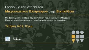 Το Μουσείο Μικρασιατικού Ελληνισμού Ελληνισμού “Φιλιώ Χαϊδεμένου” σας προσκαλεί σε μία σειρά εργαστηρίων συγγραφής στην Ελληνική Βικιπαίδεια με θέμα την ιστορία, τον πολιτισμό και την παράδοση του Μικρασιατικού Ελληνισμού.